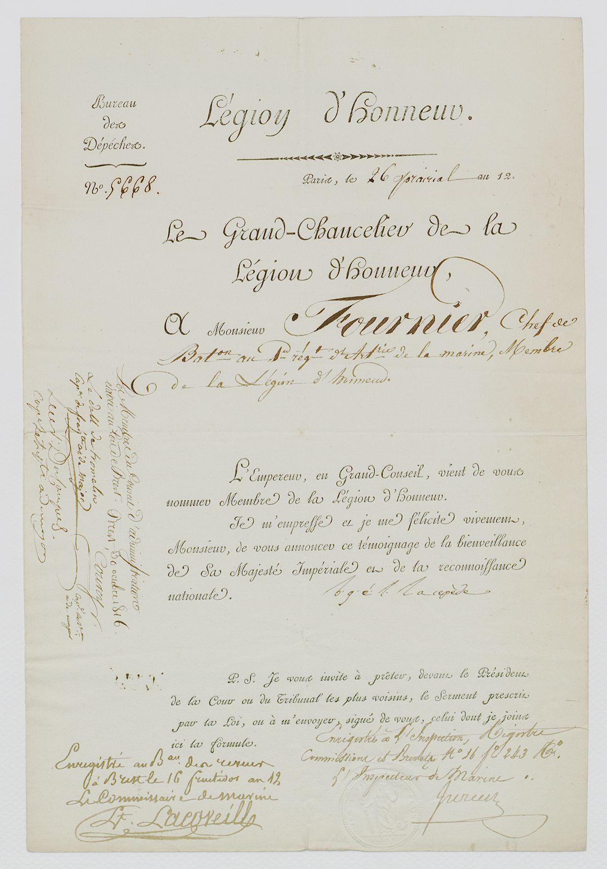 + Le 15 juin 1804 – Chevalier de l’ordre Royal et Militaire de la légion d’honneur ;