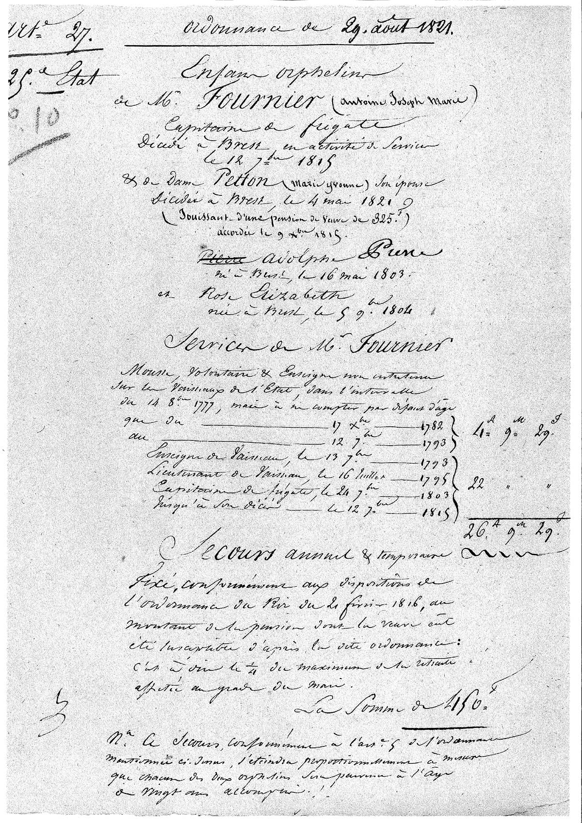 A son décès il laisse 2 orphelins en bas âge. Sa femme touchera 325 francs de pension de veuve jusqu’à son décès en 1821… une pension sera ensuite versée pour les 2 orphelins qui rejoindrons leur oncle.