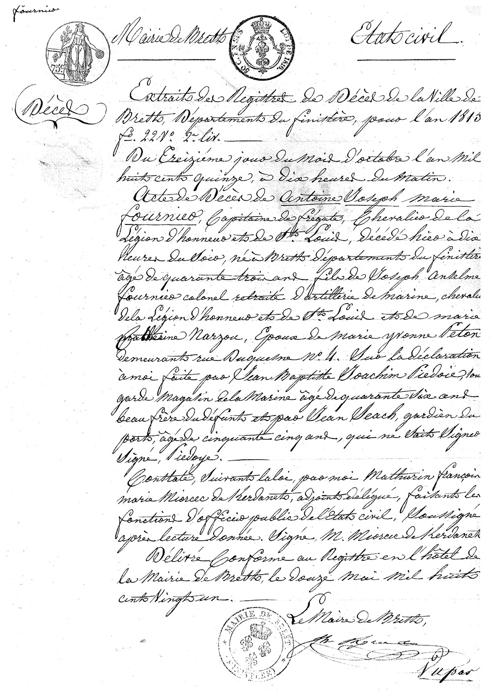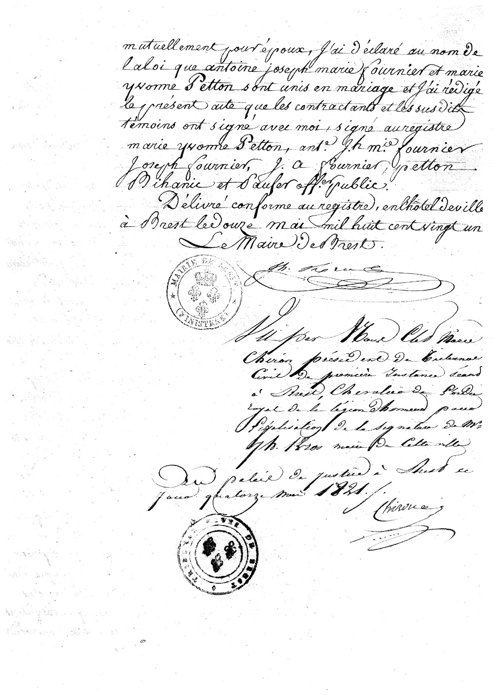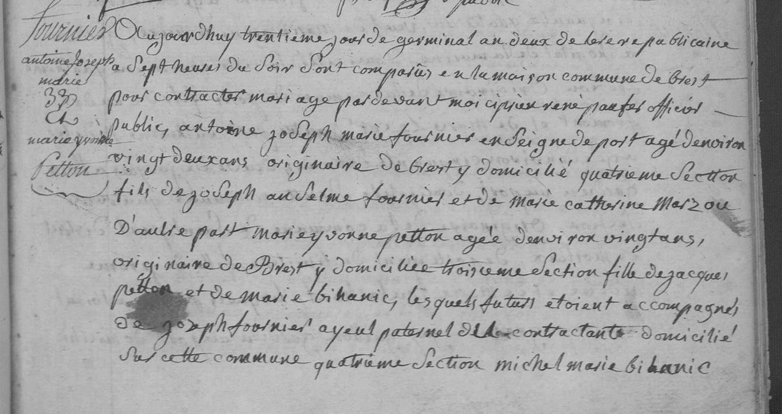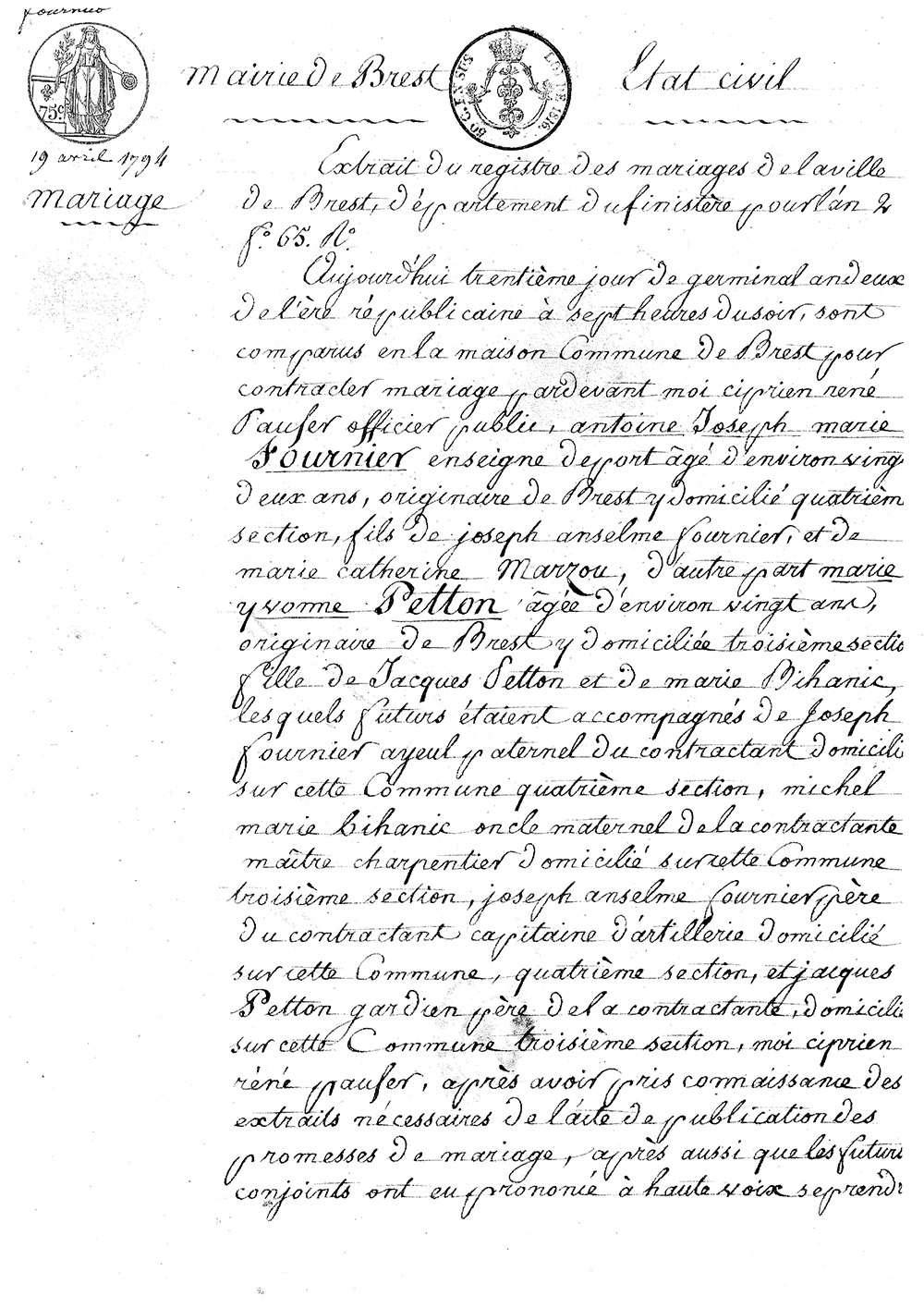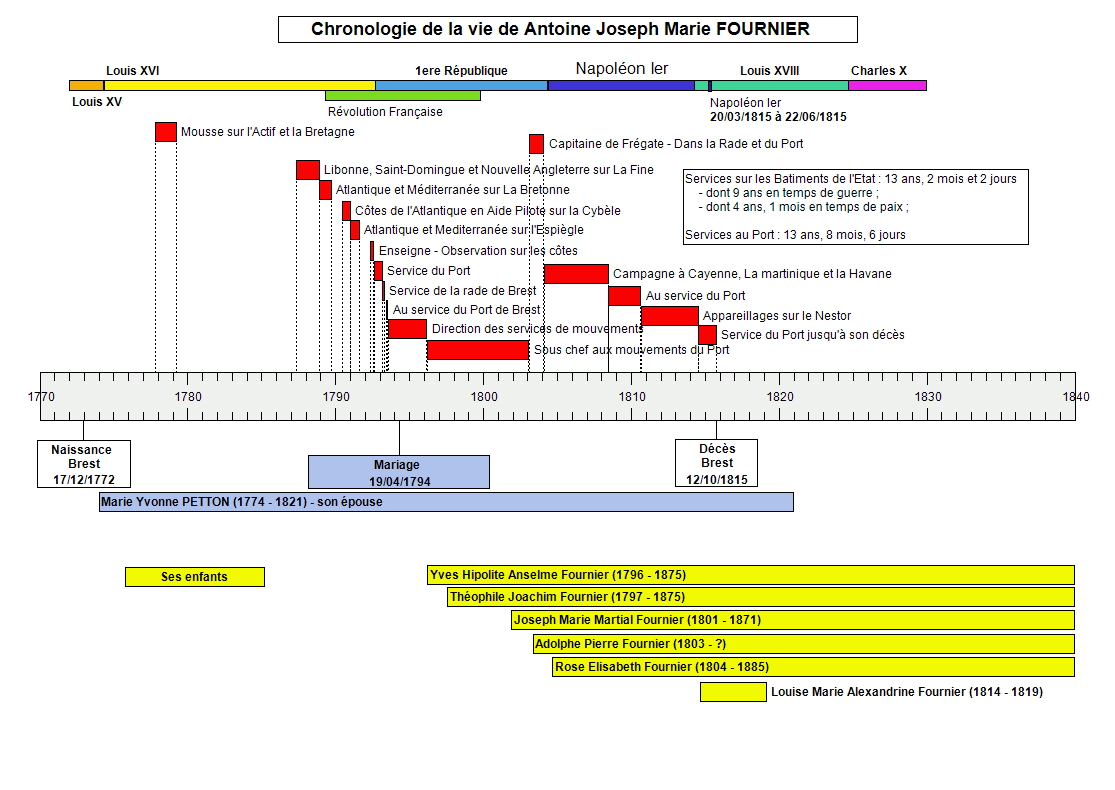 Mariage le 19 avril 1794 avec Marie Yvonne PETIT à Brest en présence de de son père et de son grand-père Joseph FOURNIER. On imagine une grande fête réunissant toute la famille à cette occasion !