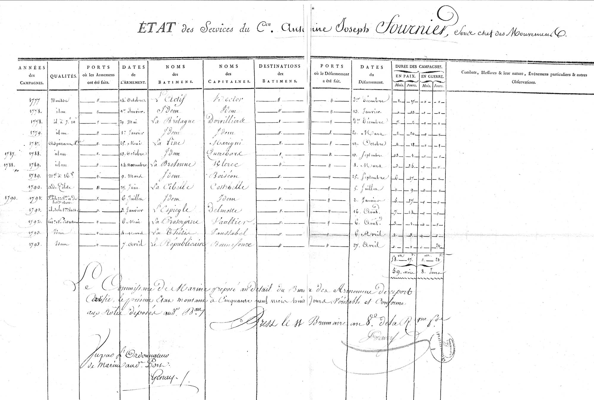 14/10/1777 au 13/01/1778 (5 ans) : Mousse sur le vaisseau l’Actif sous les ordres du commandant Hector – en temps de paix.
