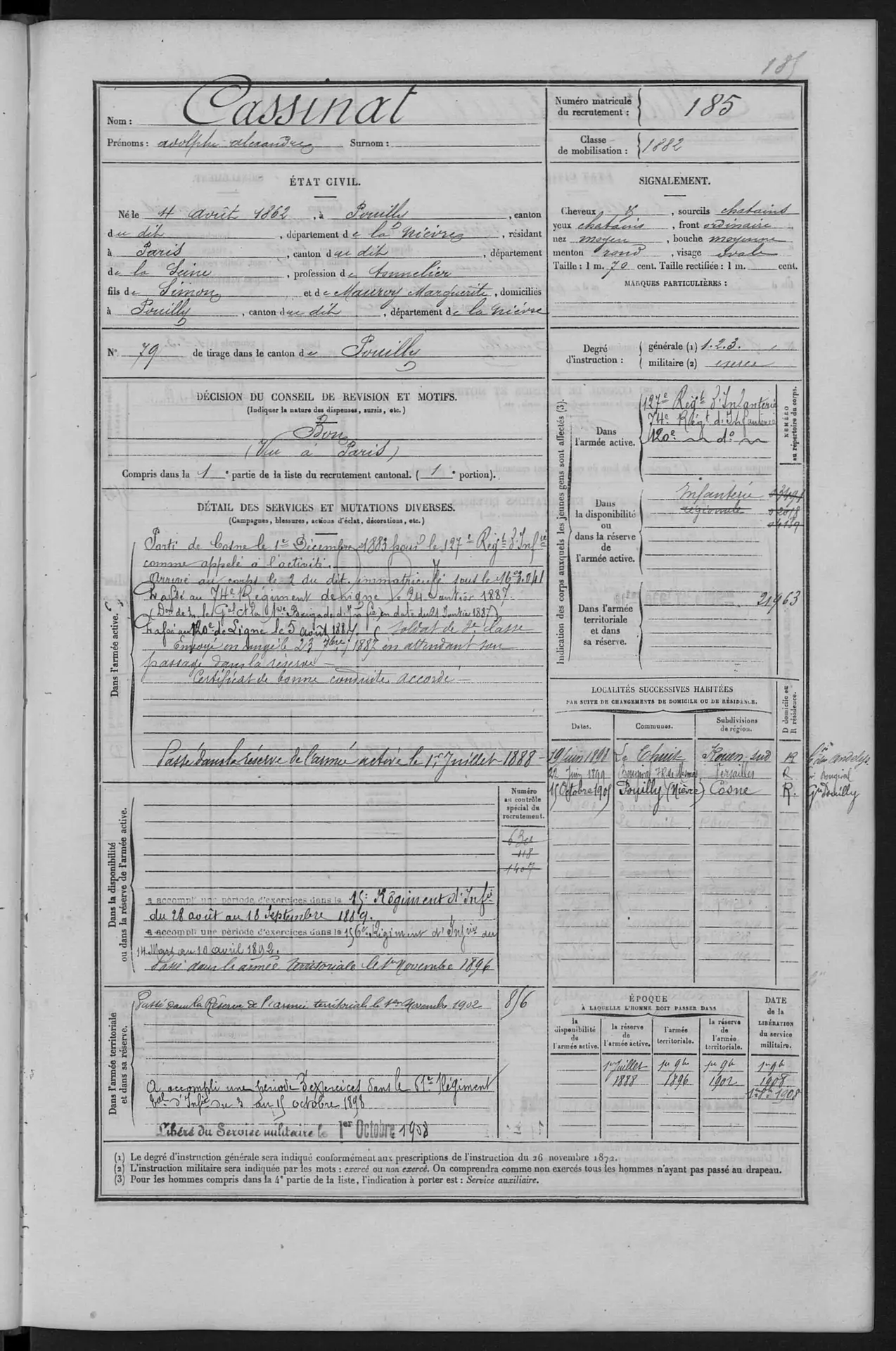 A l’âge de 20 ans, Adolphe est tonnelier comme de tradition familiale et on retrouve sa résidence à Paris, au moment où est remplie sa fiche militaire. Il entre alors pour faire son service militaire. Le tirage au sort (règle de l’époque) l’aura désigné pour 5 ans de services… pas de chance !