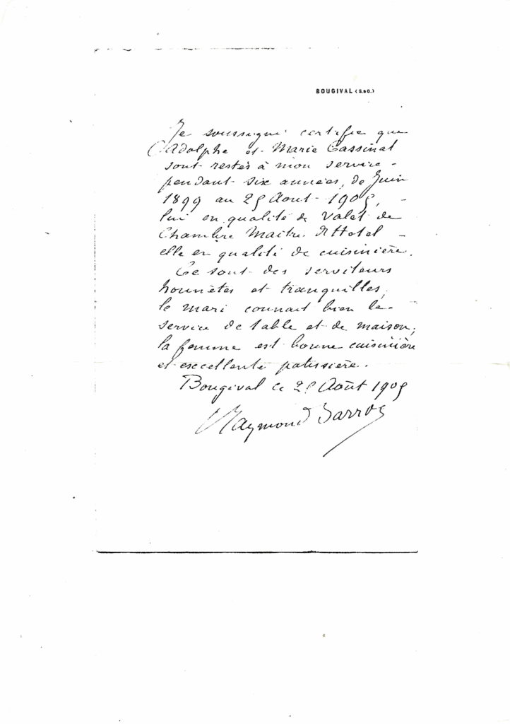 Après les GUYNEMER, et donc une lettre de recommandation en poche, les CASSINAT trouvent un nouvel emploi, 15 jours plus tard, du côté de Bougival… à priori chez les BARROS… mais jusque là je n’ai pas pu trouver de traces d’un Raymond BARROS de manière formelle… Ils y resteront tout de même 6 ans… jusqu’au 25 aout 1905 !