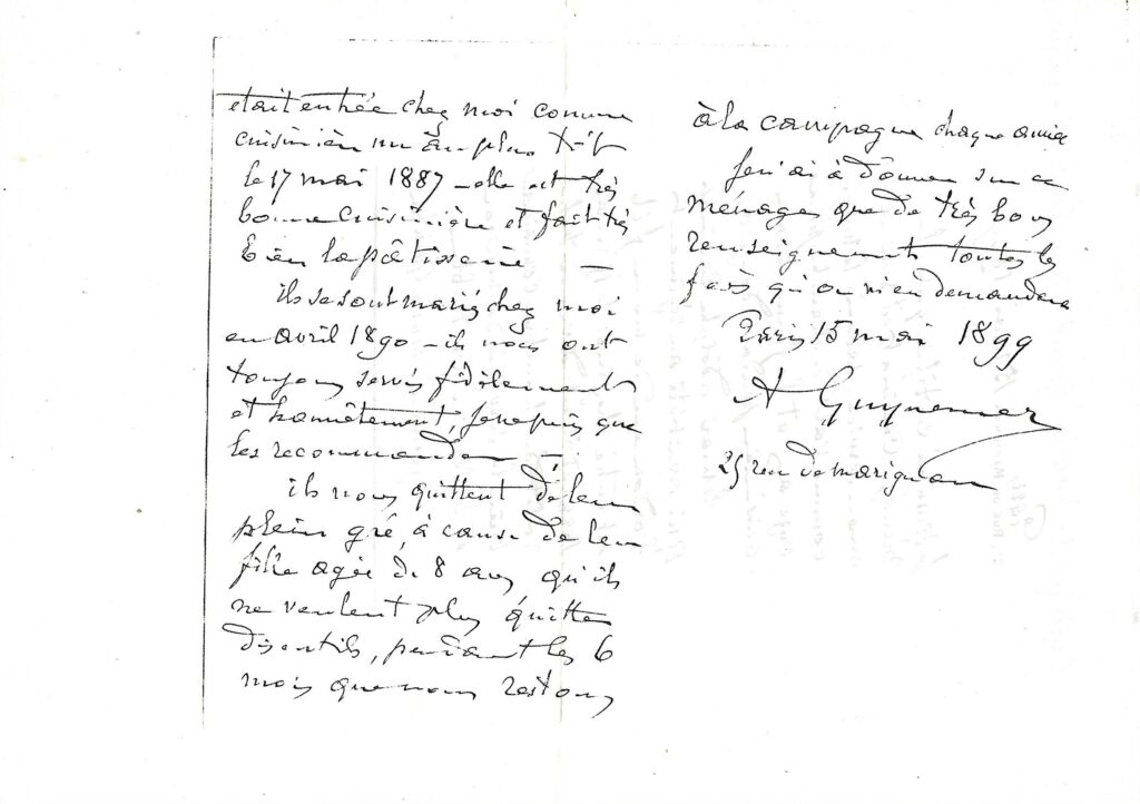 Mais les déplacements leurs pèsent… ils doivent laisser leur fille pendant plusieurs mois de l’année. Ne souhaitant plus cela ils décident de trouver un autre emplois de domestique. Il seront restés pendant 12 ans chez les GUYNEMER.